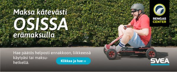 Esimerkkiostos: 1 500 €, 12 kk maksuvaihtoehdolla. Vuosikorko: 0 %. Luottokulu/kk: 5,60 €. Todellinen vuosikorko: 4,01 %. Luoton kustannukset: 61,60 €. Maksettava yhteensä: 1561,60 €. Osamaksuerä/kk: 130,60 €, 12 erää. Rengascenter-Tili on jatkuva luotto, jonka minimiluottoraja on 2 000 €. Luoton muusta käytöstä voi seurata korkeampi tai alempi todellinen vuosikorko. Luotonantaja: Resurs Bank AB Suomen sivuliike.